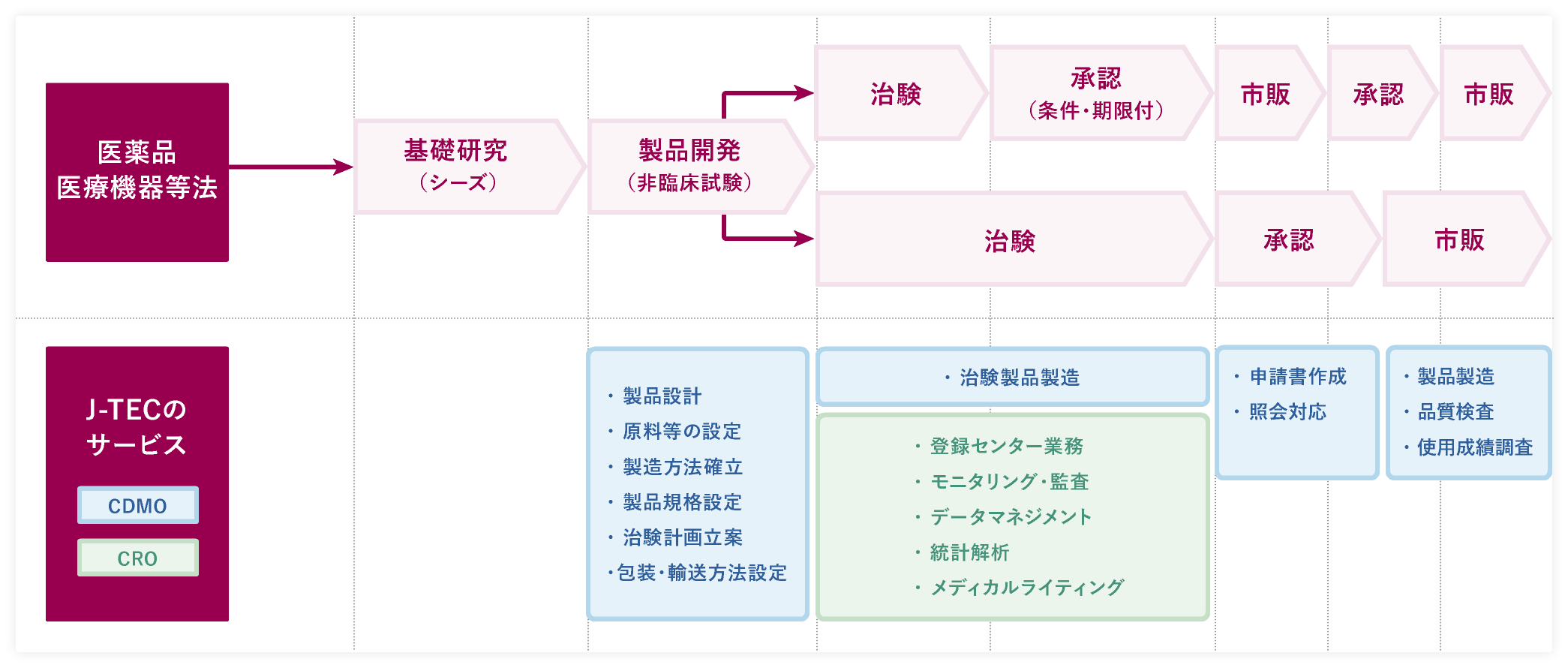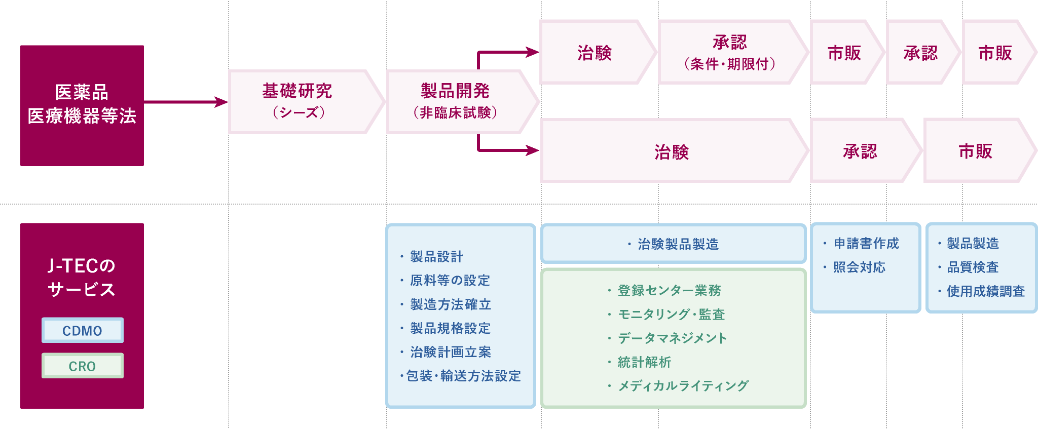 再生医療等製品の開発から市販後対応まで必要なすべての機能を保有しており、ワンストップかつシームレスに対応します。
